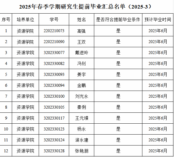 根据学校的相关通知要求,经研究生个人申请,学院初审,ag电子试玩 2023级硕士研究生(不含硕博连读、提前攻博研究生)、2022级博士研究生(不含直博生)、2020级直博生申请提前毕业名单如下,如有异议,请公示期内书面反馈意见至研究生科(联系人:周老师,办公室:主楼336,电话:67883627),公示期即日起至2025年3月2日。