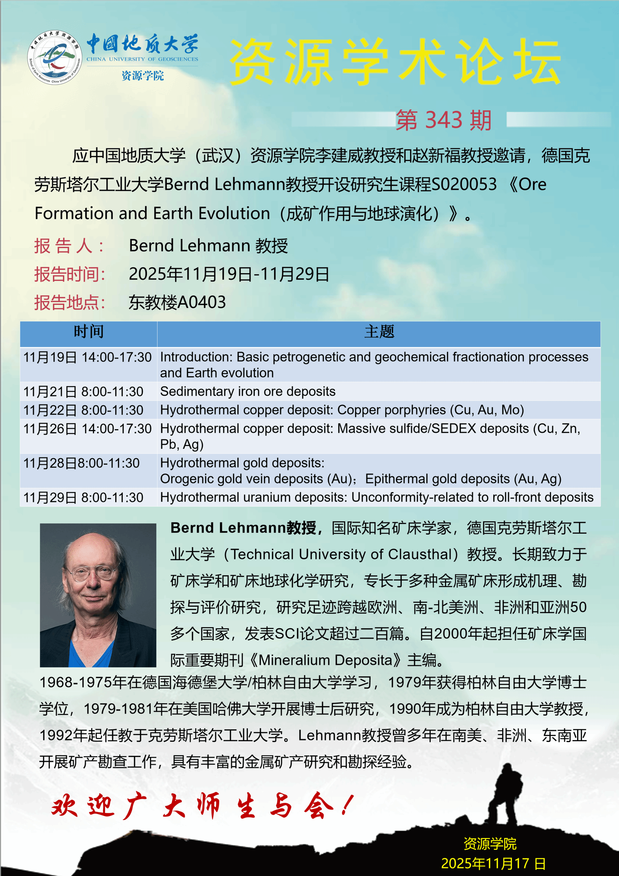 【11月19日-11月29日】第343期资源学术论坛:Bernd Lehmann学术报告