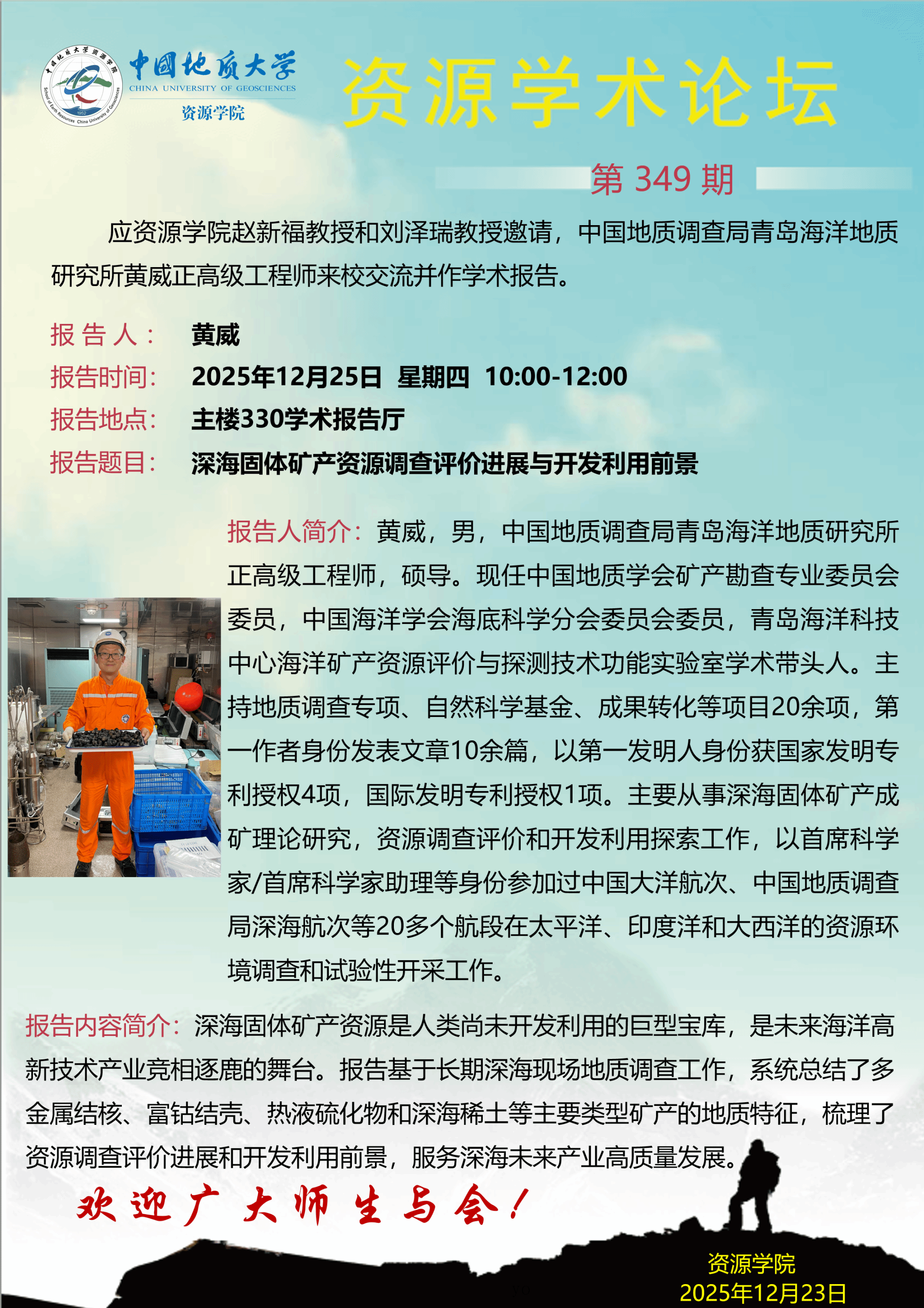 【12月25日】第349期资源学术论坛:黄威学术报告