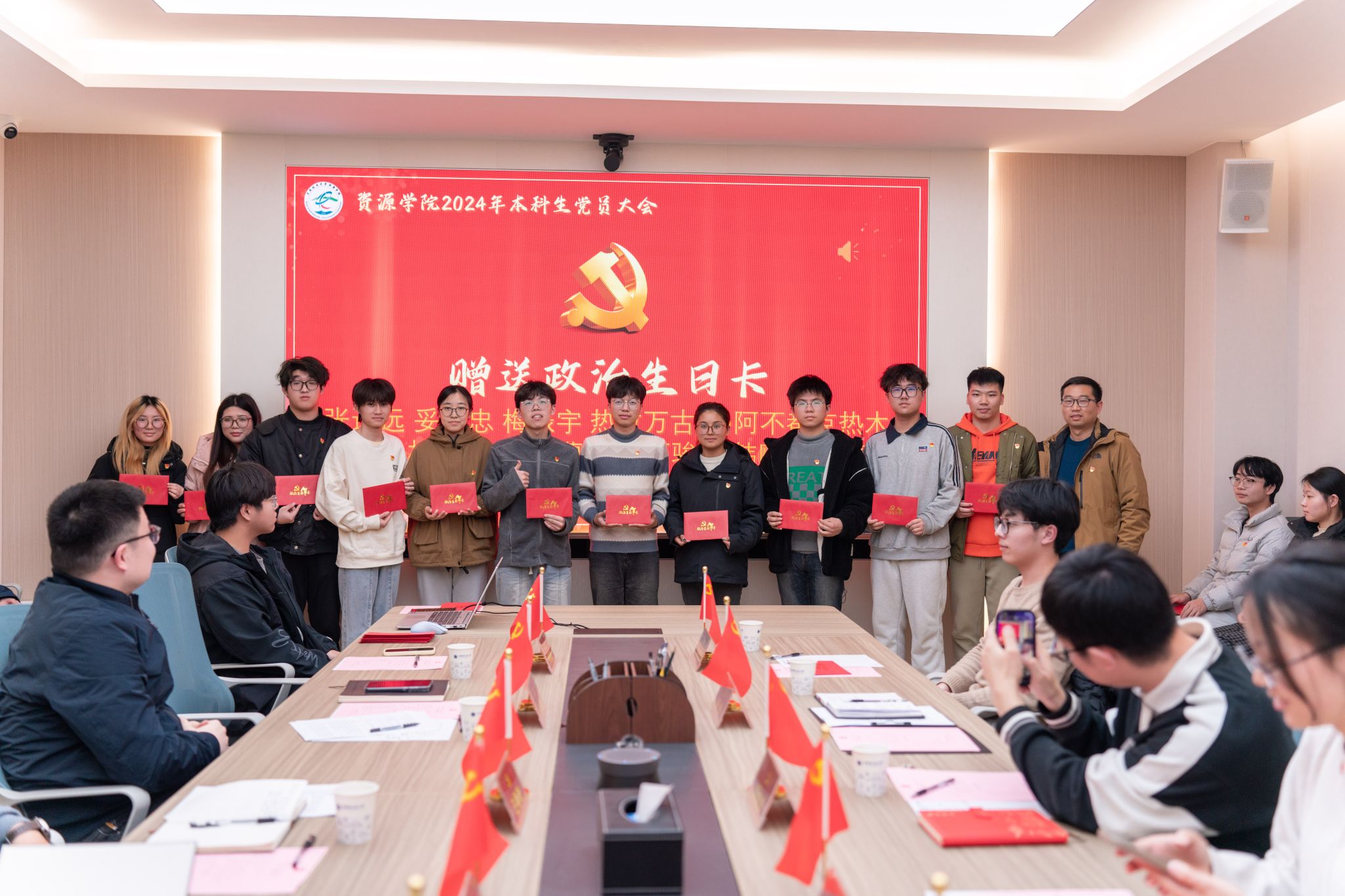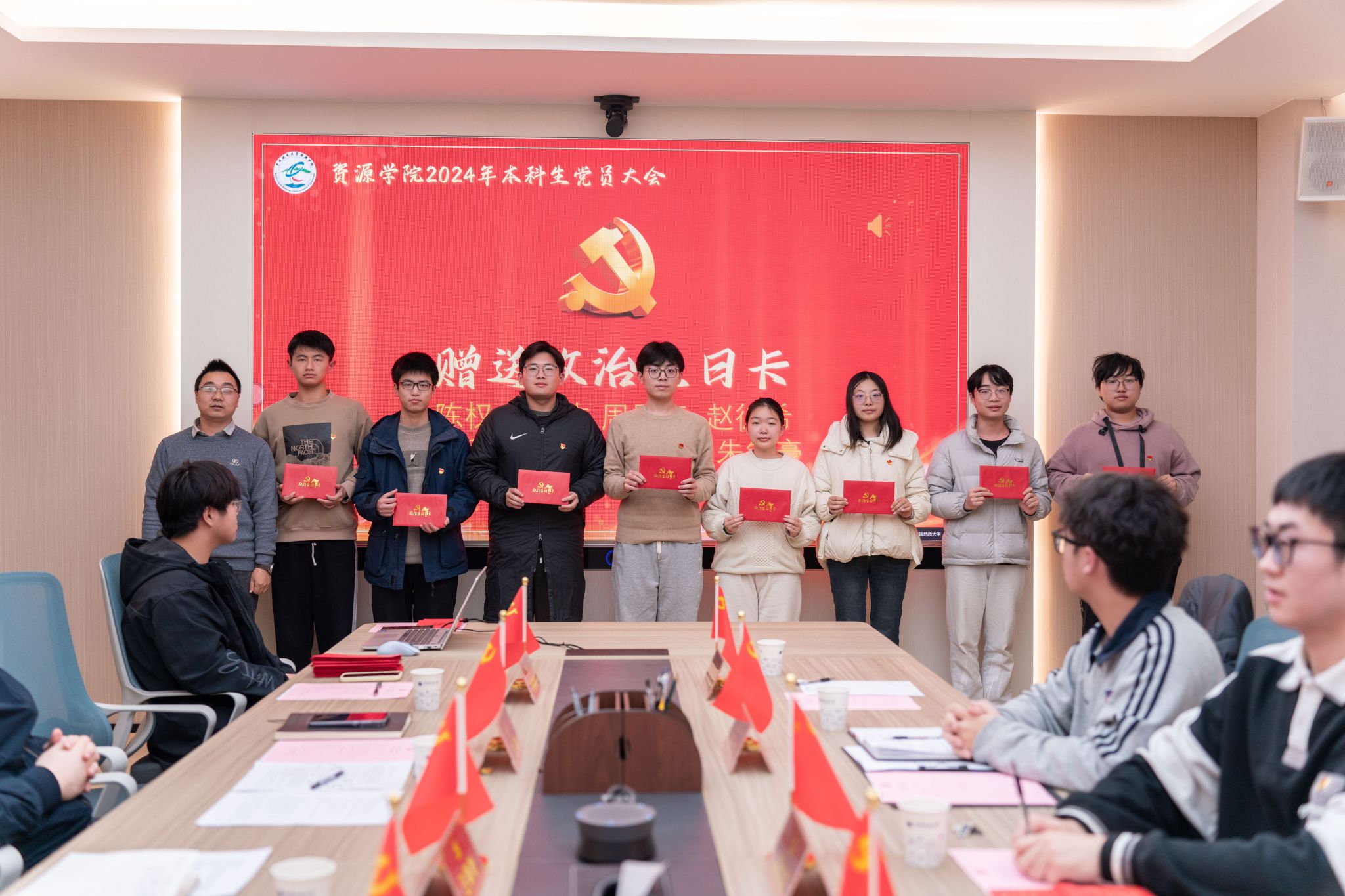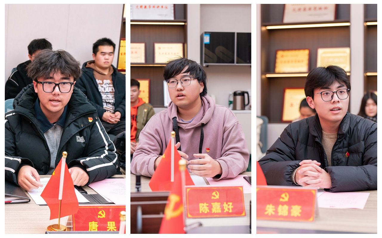 汪再奇,谭文伦,彭鑫分别为2022级本科生新发展党员颁发政治生日卡。