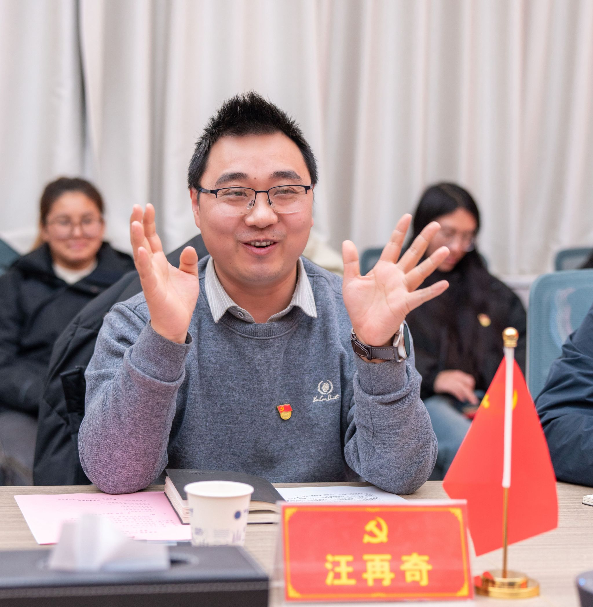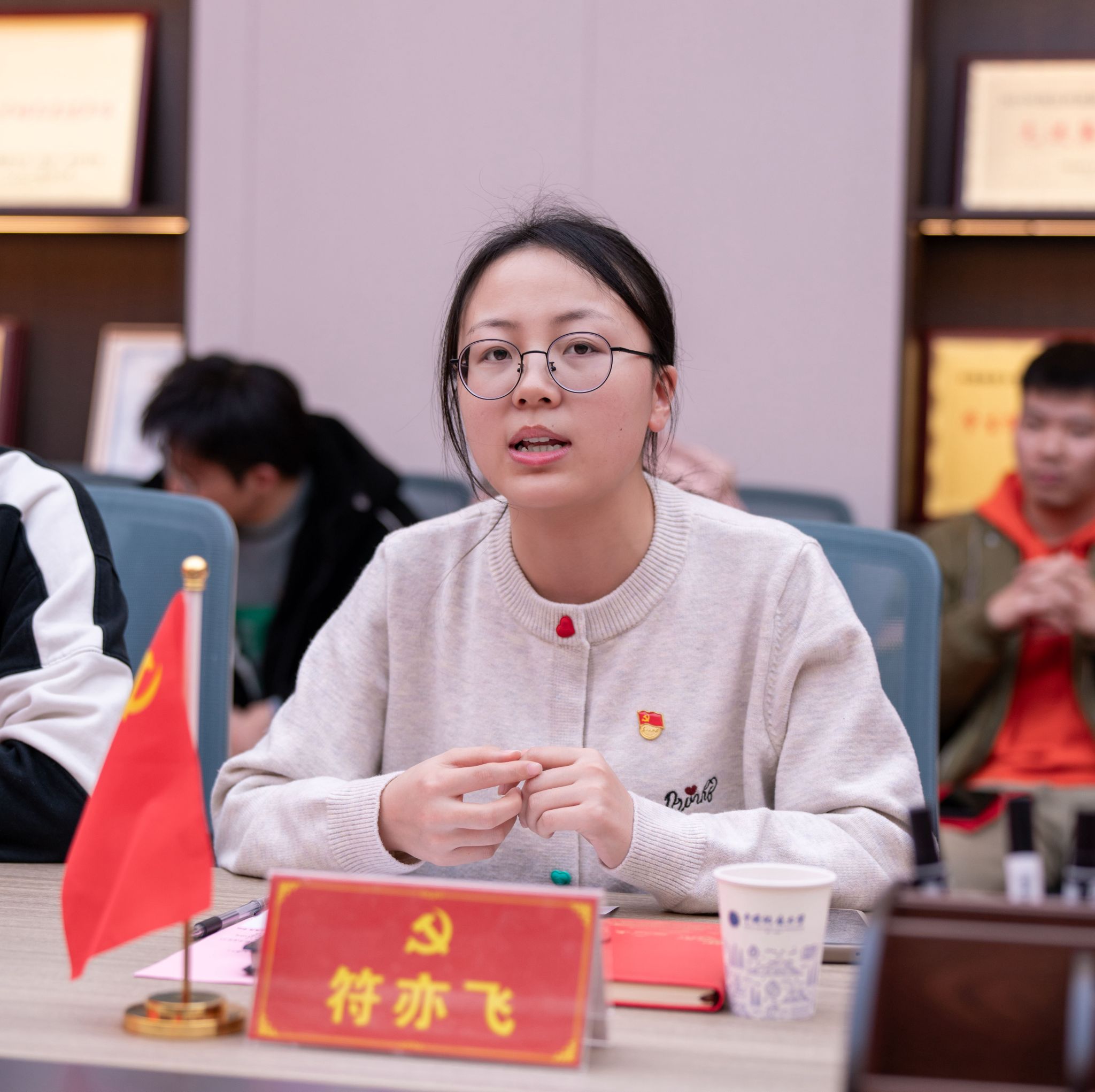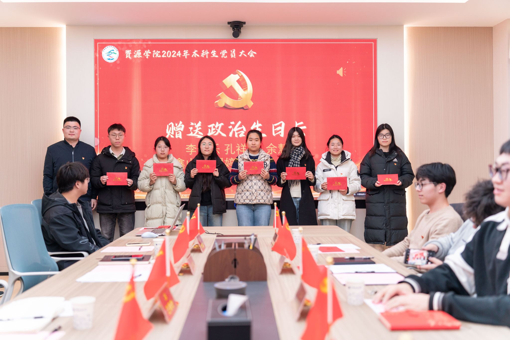 汪再奇,谭文伦,彭鑫分别为2022级本科生新发展党员颁发政治生日卡。