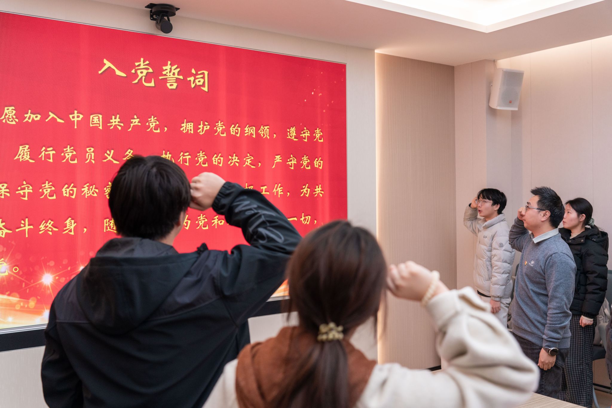 会上举行重温入党誓词仪式,学院党委书记汪再奇领誓。