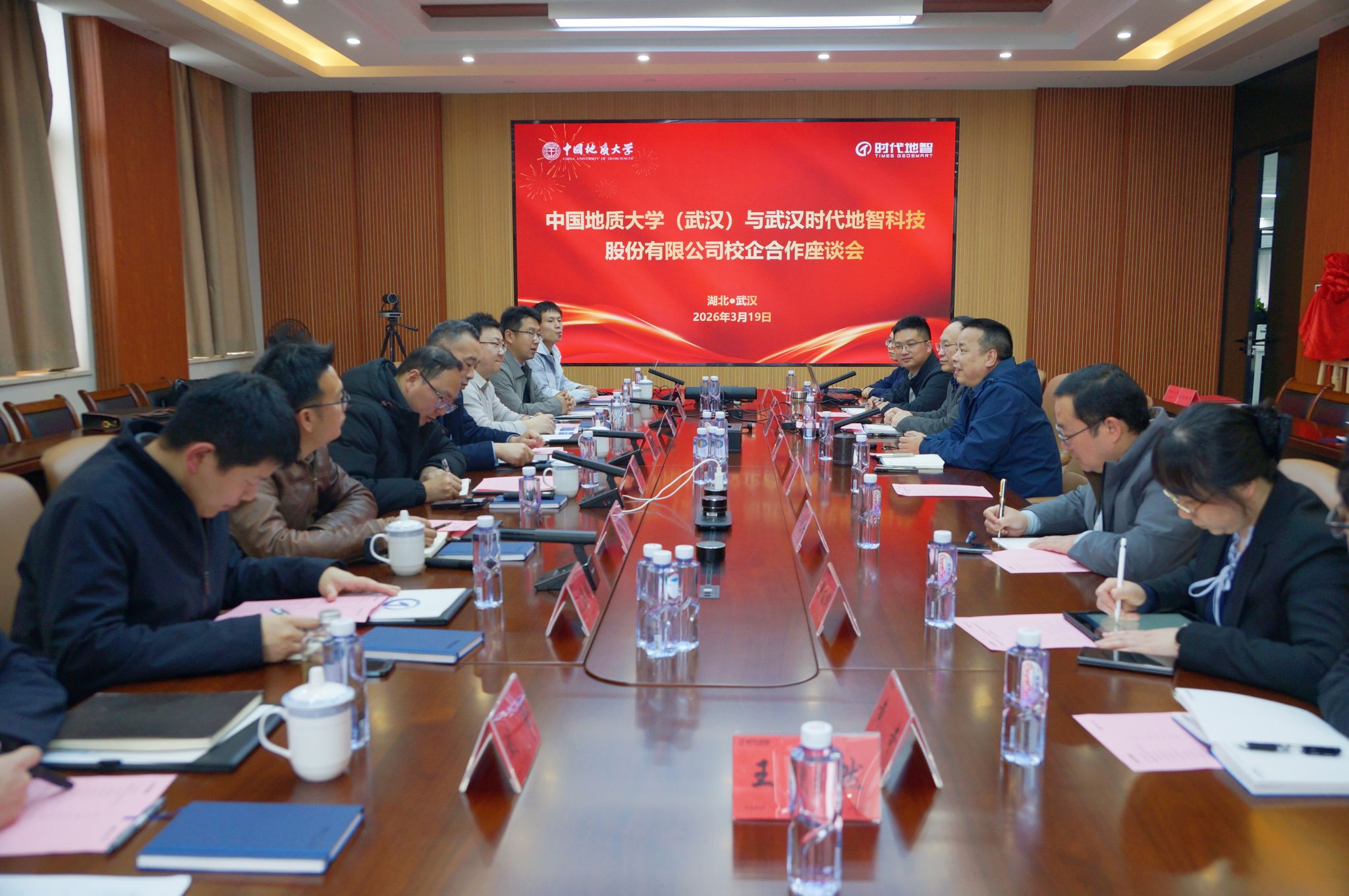 院长朱红涛一行赴武汉时代地智科技股份有限公司(以下简称“时代地智”)拓展产学研合作,签署合作协议,共建“地质e站”。“时代地智”党支部书记、董事长兼总经理夏震主持座谈交流。