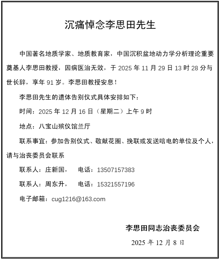 李思田先生心怀祖国、对党忠诚,将毕生精力奉献给国家能源安全与科技教育事业,其爱国奉献、严谨求实、甘为人梯的精神,将永远激励后人。