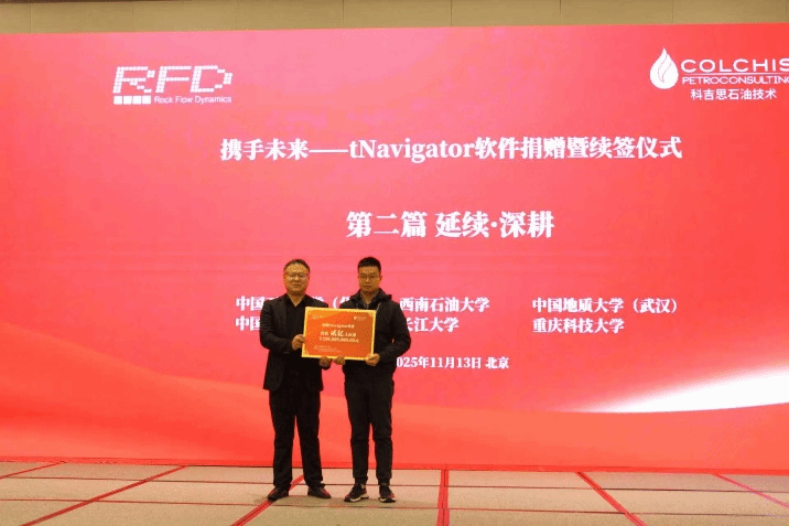 学术副院长杨峰和石油工程系教师雷霆出席了科吉思石油技术公司和俄罗斯Rock Flow Dynamics (RFD)公司联合举办的《2025精细油气藏高效勘探开发学术交流会暨tNavigator技术研讨会》暨tNavigator 软件捐赠仪式。